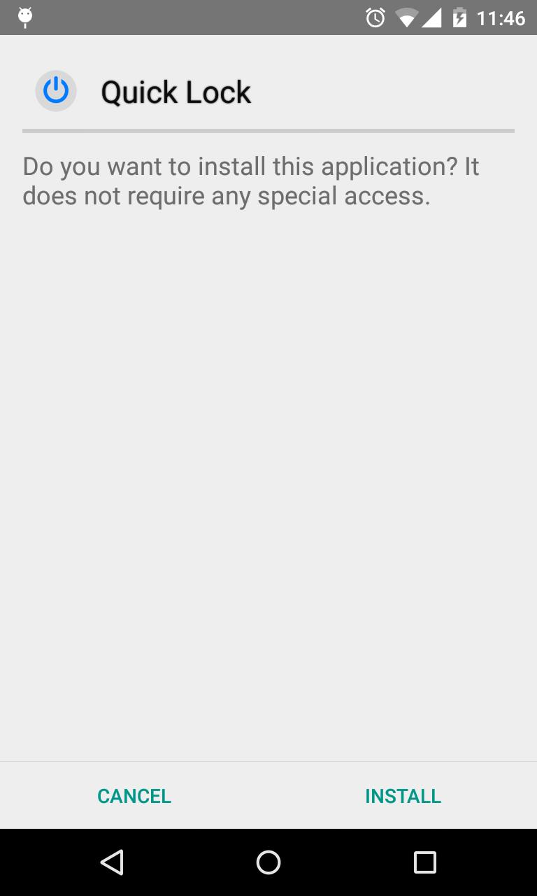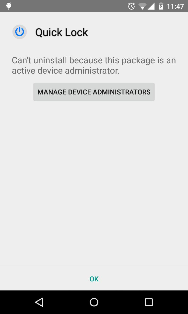アプリケーションをアンインストールする場合は、「設定 - >セキュリティ - >デバイス管理者」のQuick Lockをキャンセルしてから、通常のアプリケーションとしてアンインストールしてください。